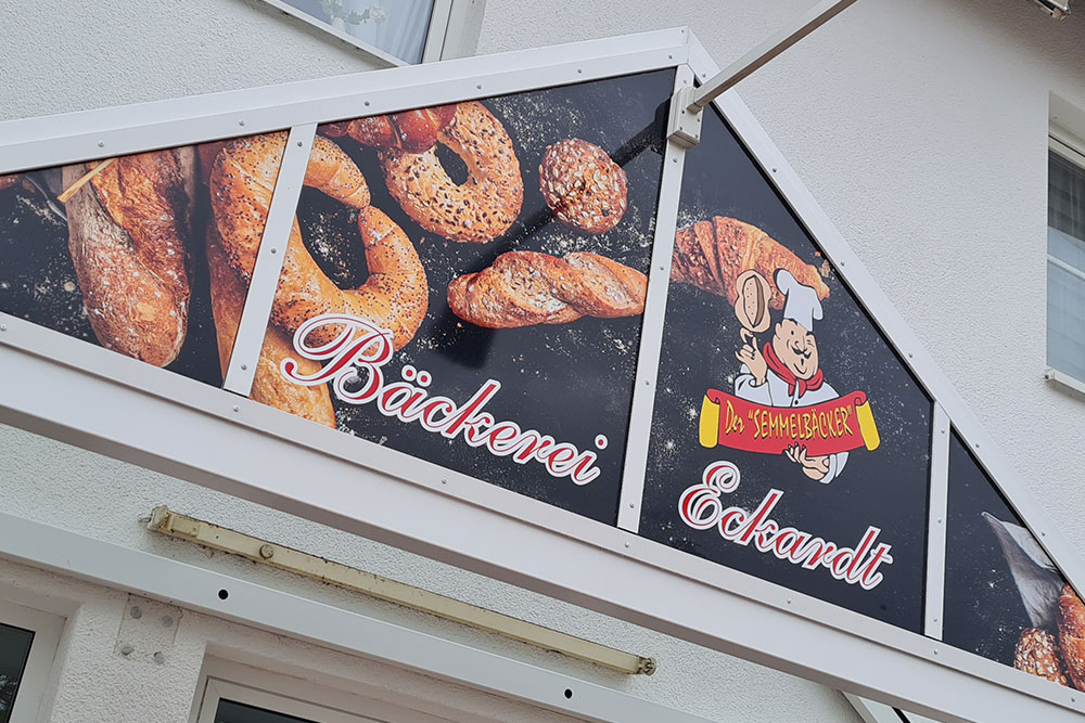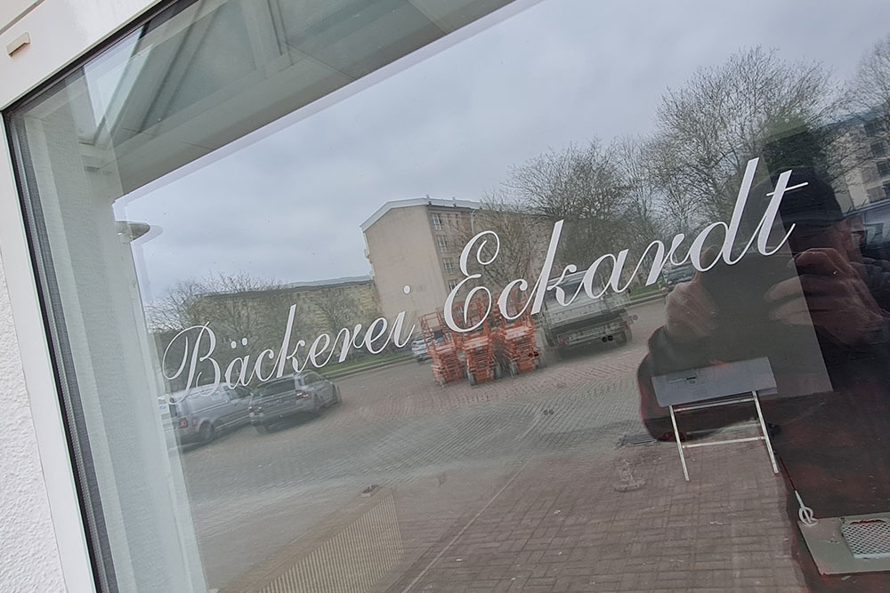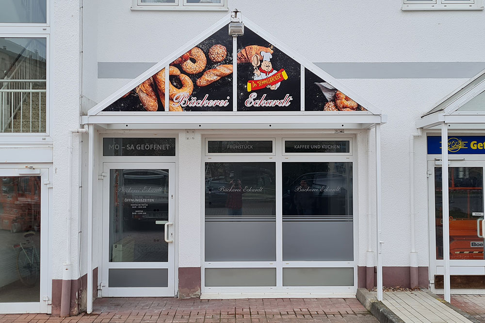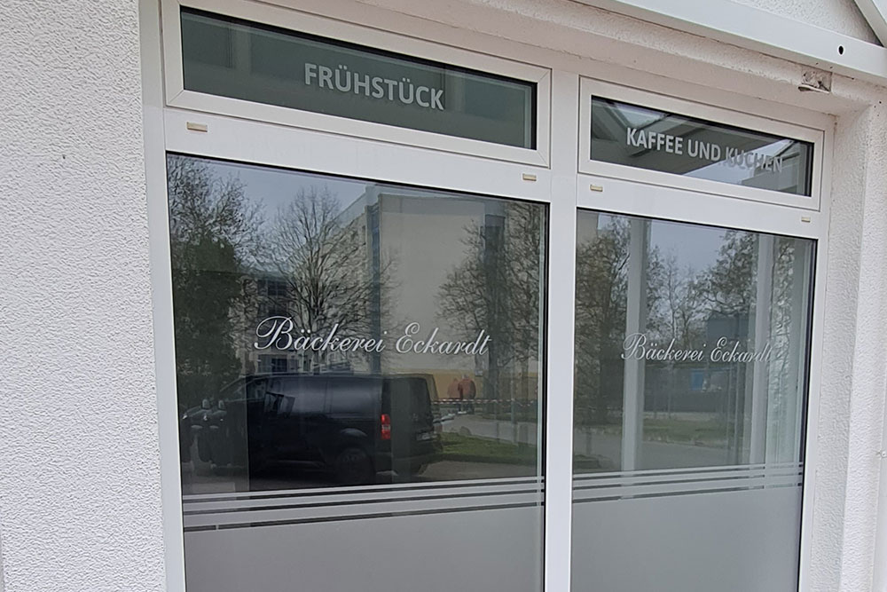 Schaufensterfolierung mit Glasdekorfolie und 4C-Folie für die Filiale der Bäckerei Eckardt in Bad Salzungen.