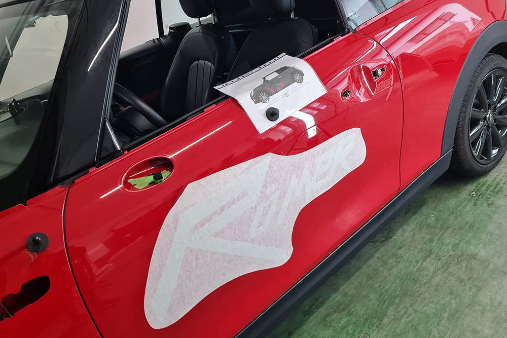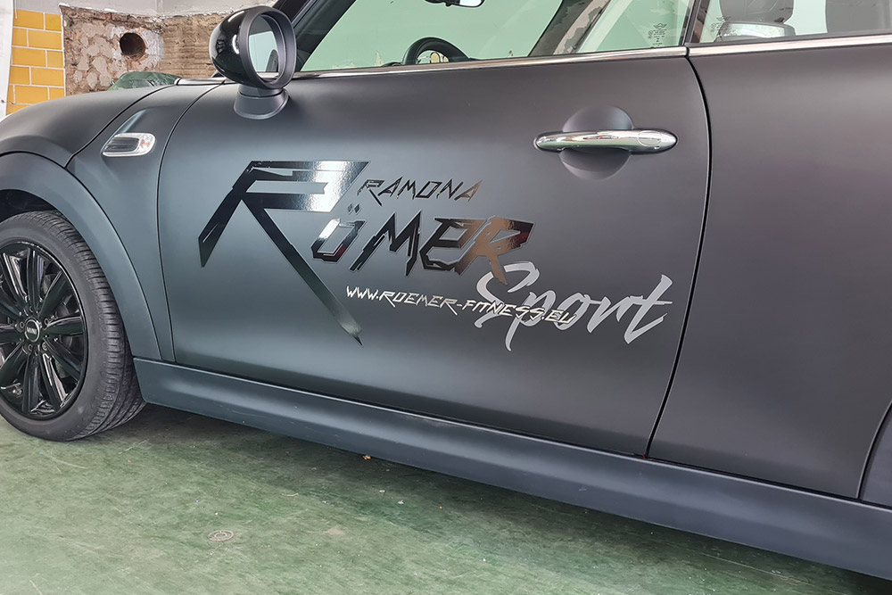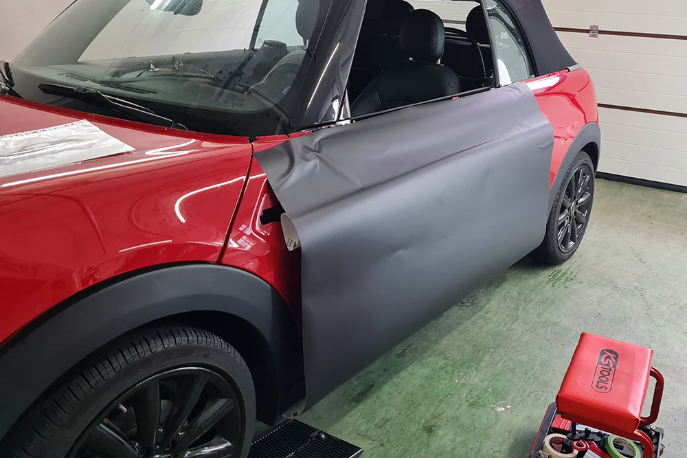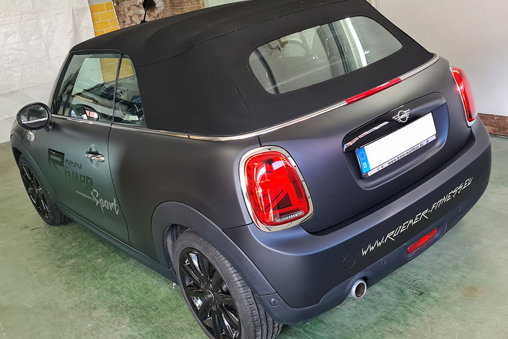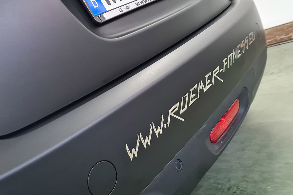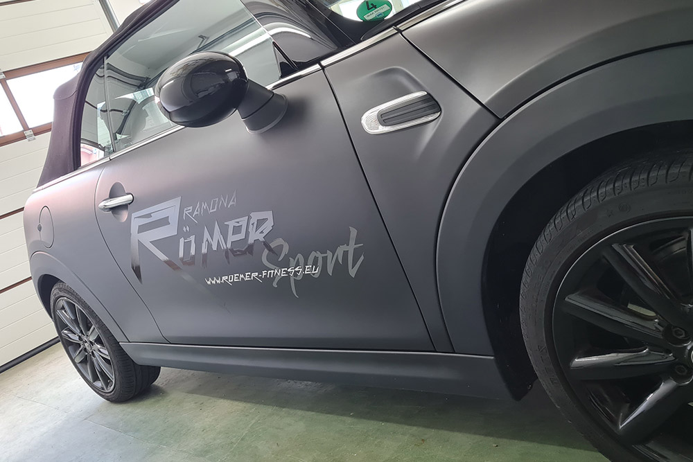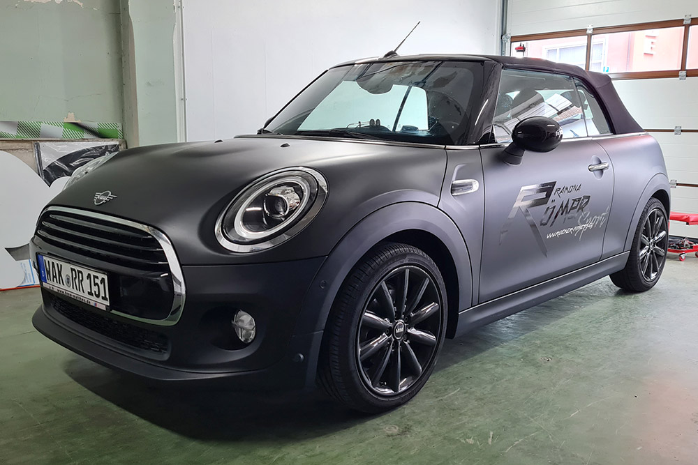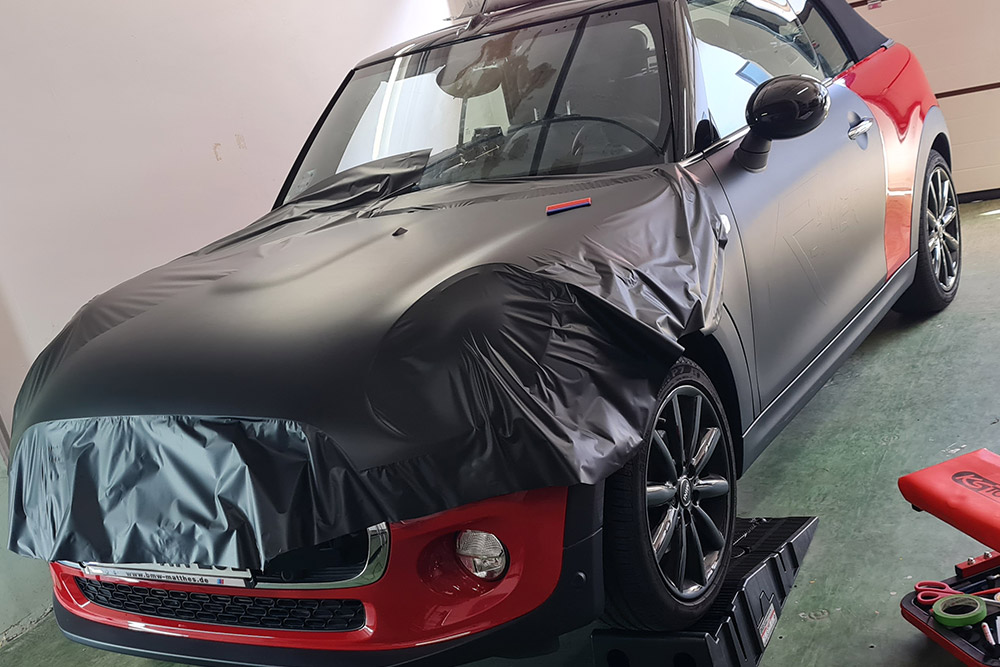 Vollfoliertes Auto - von original rotem Glanzlack auf Schwarz-Matt-Folie. Inkl. 3D-Logos / Schriften.