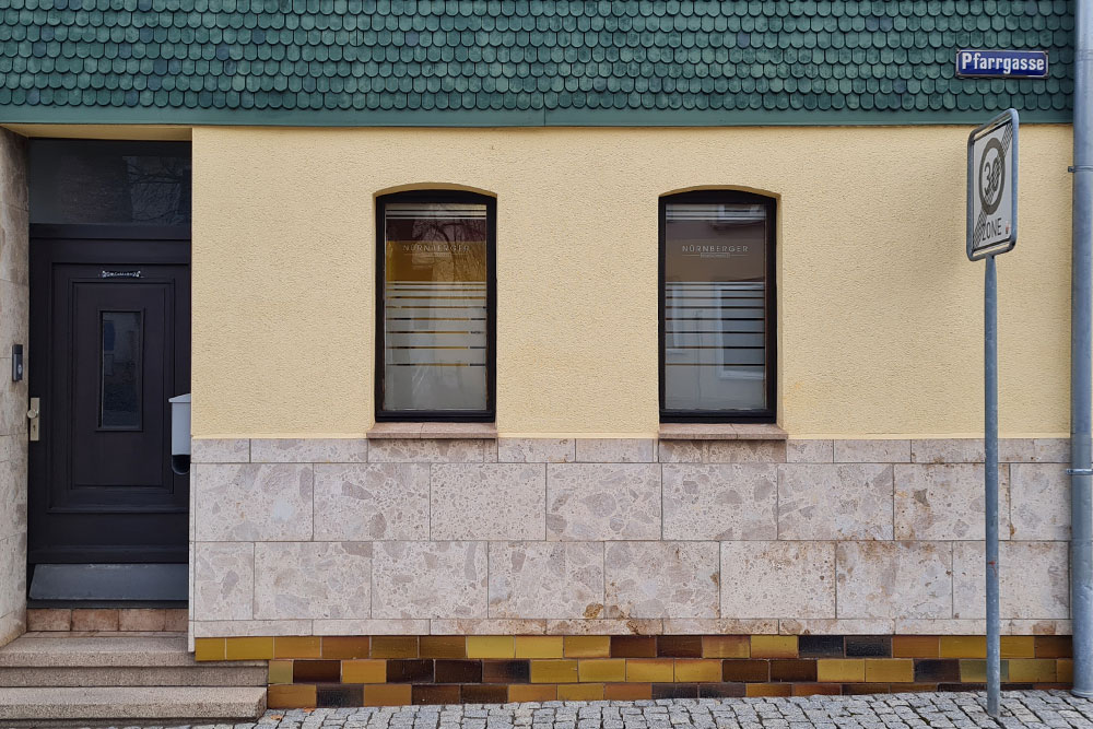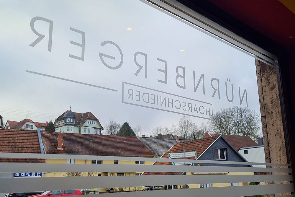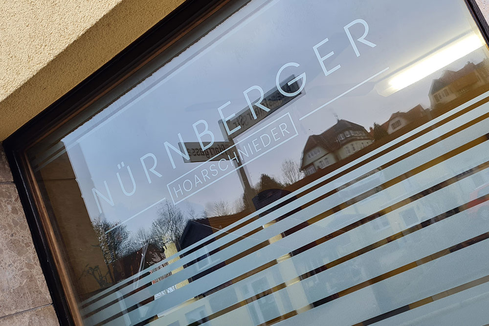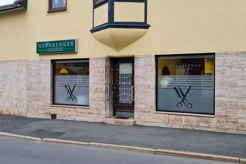 Schaufensterfolierung mit Glasdekorfolie und Leuchtschildreklame für den Friseursalon Karl Nürnberger in Schweina.